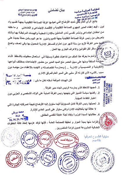 وأضاف البلاغ، انه وبعد إعفاء المدير الجهوي للصناعة التقليدية والاقتصاد الاجتماعي والتضامني، وما خلفه من احتقان اجتماعي وتذمر نفسي لدى العاملين بالإدارة المعنية والهيئات المرتبطة بها وذلك بتحريض من رئيس غرفة الصناعة التقليدية بجهة كلميم وادنون هاهو اليوم، ومنذ أزيد من ستة أشهر، يشن حملة جديدة على مدير الغرفة دون احترام للمساطر الإدارية المعمول بها وفي تعسف واضح وتجاوز سافر لكل القوانين والاعراف الجاري بها العمل.