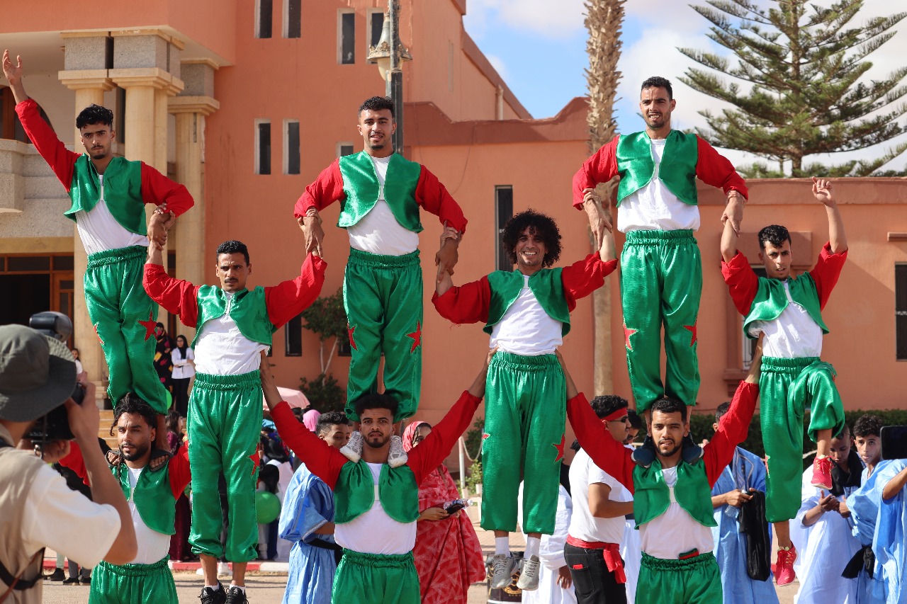 واستهلت هذه اللوحات الفنية بموكب الجمال واستعراض للزي التقليدي المحلي المتمثل في الدراعة وهي لباس للرجال والملحفة وهي زي النساء وطقوس العرس الصحراوي وطقوس الحناء والحرف التقليدية المحلية وطقوس الزواج بمنطقة الصحراء، إضافة الى مجموعة من الرياضات والألعاب التقليدية الشعبية التي تعد أحد المكونات التي تؤثث الثقافة الحسانية من قبيل “أكبيبة” وهي لعبة جماعية قد تصل الى عشرين فردا في فريق واحد وتلعب بحمل فريق للفريق الثاني على ظهره وتمرير الكبة بين الراكبين شرط عدم سقوطها، وتمارس هذه اللعبة من \رف الشباب و الصغار لتمرينهم على ركوب الخيل “أردوخ” وهي لعبة عضلية تشبه المصارعة الحرة” أراح" وهي لعبة رجالية بامتياز تجسد القوة والصبر والقدرة على التحمل وتشكل من ثلاث عناصر الهدف والمدافع عنه والمهاجمون وكل هذه الألعاب تمارس في أوقات ومناسبات متفاوتة ،تبعا لوظائفها وأدوارها كما انها تجسد في دلالاتها معاني التضامن والتكافل الاجتماعي .